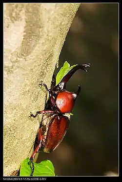 The Japanese rhinoceros beetle (Allomyrina dichotoma), also known as the Japanese rhino beetle, the Japanese horned beetle, or by its Japanese name kabutomushi (兜虫, 甲虫 or カブトムシ), is a species of rhinoceros beetle. They are commonly found in continental Asia in countries such as China, the Korean peninsula, Japan, Vietnam, Burma, Thailand, and Taiwan.[2] In these areas, this species of beetle is often found in broad-leaved forests with tropical or sub-tropical climates.[2] This beetle is well known for the prominent cephalic horn found on males.[3] Male Japanese rhinoceros beetles will use this horn to fight other males for territory and access to female mating partners. Upon contact, males will attempt to flip each other onto their backs or off of their feeding tree.[3] In response to selective pressures, smaller male A. dichotoma have adapted a "sneak-like behavior". These smaller beetles will attempt to avoid physical confrontation with larger males and try to mate with females.[3]