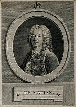 In 1718, de Mairan was inducted into the Académie Royale des Sciences.[1] The Cardinal de Fleury and the Count of Maurepas selected Mairan to replace Bernard le Bovier de Fontenelle as "Secrétaire perpétuel" of the Académie in 1740, a position he accepted only for 3 years, and thus duly resigned in 1743.[1] De Mairan also served as the Académie's assistant director and later director intermittently between 1721 and 1760.[1] Eventually, de Mairan was appointed editor of the Journal des sçavans, a science periodical, by Chancellor d'Aguesseau.[1] Also, in 1735, de Mairan was elected a Fellow of the Royal Society and in 1769, a Foreign Member of the Royal Swedish Academy of Sciences as well as to the Russian Academy (St. Petersburg) in 1718.[1] De Mairan was also a member of the Royal Societies of London, Edinburgh, and Uppsala; the Institute of Bologna,[1] and the Academy of Rouen.[12] With Jean Bouillet and Antoine Portalon, he founded his own scientific society in his hometown of Béziers, named the Académie de Béziers, around 1723.[1]