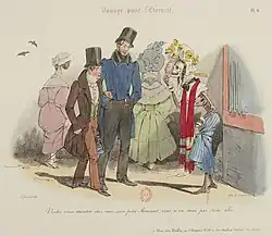 Grandville's parents had friends and family in Paris working in the theater who provided work and connections early on, including a relative, Frédéric Lemétheyer, who was a stage manager in the Opéra-Comique. He began using his pseudonym, "Grandville" in Paris. It was derived from "Gérard de Grandville", his paternal grandparents stage name when they were actors and worked in the court of Lorraine. The pseudonym Grandville appeared in numerous variations throughout his career, including Grandville, Jean-Jacques Granville, J. J. Grandville, Jean Ignace Isidore Grandville, J. I. I. Grandville, Jean de Granville, and other variants. He designed illustrations for decks of playing cards and worked with Hippolyte Lecomte, a painter and ballet set designer in Paris, for whom he produced a set of color lithographs Costumes De Théãter in 1826. That set was followed by additional series including 12 lithographs created for the printer Langlumé titled Les Dimanches d'un bourgeois de Paris ou Les tribulations de la petite propriété (Sundays of a Paris Bourgeois or The Tribulations of Small Property), in 1826. Subsequent collections included 53 prints in La Sibylle des salons (The Sibyl of the Salons) in 1827 and 12 prints in Titres pour morceaux de musique (Titles for Musical Pieces) in 1828.[5][6][7]