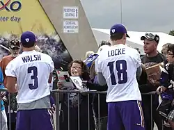 Locke signing autographs at the Vikings' training camp in 2014 with placekicker Blair Walsh.