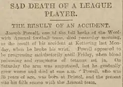 In a United League match against Kettering on 23 November 1896, Powell broke his arm/wrist, subsequently contracting blood poisoning and tetanus. Powell was too ill to travel to Guy's Hospital, so the surgeons had to come to his home to remove his arm. Despite having the arm amputated, he died six days after his injury at his Plumstead home at the age of 26.[3][4] An inquest jury returned a verdict of accidental death, with no blame attached to anyone involved.[1] He had played 92 League and FA Cup matches for the club.[4]