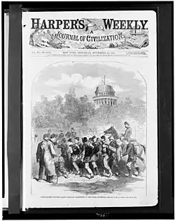 During the American Civil War, Oertel accompanied the Army of Virginia under General Burnside for several months in 1862.[1] His Virginia Turnpike and other landscapes were the fruit of his brief military experience. He painted some historical battle scenes, including one of the American Revolutionary War's Battle of Sullivan's Island, and some illustrations for Harper's Weekly, including a cover for the magazine's November 15, 1864 issue, Convalescent Soldiers Passing through Washington, DC, to Re-join their Units and The Union Scout.