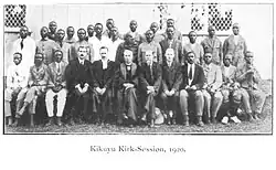 The board of elders in Kikuyu, 1920, with Arthur seated in the front row, five from the left, wearing the traditional Scottish minister's Geneva gown, complete with academic hood