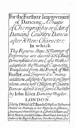 Essex was involved in several publications in the early 1700s which brought to England and explained the dance notations of the French dance masters Raoul Auger Feuillet and Pierre Rameau. Essex translated the introduction to Feuillet's Recueil de contredances (1706), and was the author of a treatise on the notation of country dances entitled, For the Further Improvement of Dancing (1710). In 1715 a second edition was printed containing 4 additional country dances to supplement the original 10 and "The Princess's Passpied", his only surviving ball dance.[3] His most important book appeared in 1728 The Dancing-Master, or, The Art of Dancing Explained, which was a translation with diagrams of Rameau's Le maître à danser (1725). This ran to a second edition in 1731 and a third about 1733 which included new illustrations by George Bickham the Younger. A fourth edition appeared in 1744, the year of his death.[1]