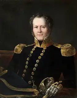 Maitland was born in Scotland in 1771, the third son of Colonel the Honourable Richard Maitland, who was himself the fourth son of Charles Maitland, 6th Earl of Lauderdale.[1][2] His mother was Mary Maitland, née McAdam, of New York City. John Maitland was born into a substantial naval dynasty. His uncle was Frederick Lewis Maitland, who was a captain in the navy, and his first cousin was Frederick Lewis Maitland, who reached the rank of rear-admiral.[1] John Maitland also entered the navy, and by 1793 was a midshipman aboard John Jervis's flagship HMS Boyne. Maitland was involved in the attacks on the French colonies of Guadeloupe and Martinique, often serving on shore with landing parties.[1][2] In the assault on Fort Fleur d'Épée he was the first person over the walls, and came to the rescue of Captain Robert Faulknor when Faulknor was attacked by two Frenchmen. Maitland ran one through with a pike and went on to kill another seven or eight of the garrison.[1][2] During the attack on Pointe-à-Pitre, Guadeloupe, Maitland took over command of the landing parties as an acting-lieutenant when all of the more senior officers had been killed or incapacitated by wounds or exhaustion.[1][2]