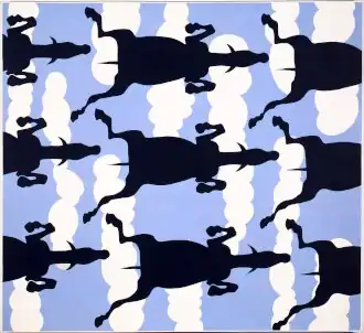Throughout the latter half of his career, Wesley continued to refine his approach, balancing concision and directness with emotional complexity and offbeat subject matter.[41][42][4] His work in the 1980s often foregrounded formal concerns through frieze-like arrays of repeated nudes (e.g., Hips, 1984) or animals in decorative, wallpaper-like arrangements (e.g. Untitled (Horse and Clouds), 1988).[41][32] A series in the 1990s employed nude women—often radically cropped with their faces out of view or eyes closed—variously cooing down at viewers (as if seen from a suckling infant's perspective), floating as enveloping, oceanic bodies, or lying prone and vulnerable in the throes of ecstasy.[9][43] Jenifer Borum described these later paintings as conflating "the maternal and the erotic, effectively underscoring the infantile nature of the media's obsessional fragmentation and objectification of women." Unlike the ads, she noted, "For Wesley, the personal and the social are inseparable."[9] David Pagel identified a new level of tenderness and vulnerability in Wesley's large acrylics of the 2000s. Dominated by expanses of flesh against blue sky, works such as Smooch (2003) depicted men and women in tight close-ups of heads, necks, shoulders and hands and seemed to suggest intense moments, memories or daydreams of intimacy.[44][4]