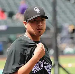 De la Rosa's .585 winning percentage is a Rockies' franchise record for pitchers with at least 50 starts.[22][23] He also leads the Rockies with 481 walks and 70 wild pitches and is second in innings pitched, behind Aaron Cook.[22]