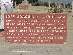 On July 25, 1813, José Joaquín de Arrillaga died at Mission Nuestra Señora de la Soledad and was buried there.[8] He is said to have been the only Spanish governor to be buried in California and on US soil,[8] but this must be a mistake, because the Spanish Governor before him, José Antonio Roméu, was buried at Carmel Mission in 1792. José Joaquín de Arrillaga's grave is at 36°24′17″N 121°21′19″W / 36.40472°N 121.35528°W / 36.40472; -121.35528.[9] The sign there has the inscription: "Known affectionately as "Papa" by his soldiers, companions and friends, he served twice as governor of California under Spanish rule. Upon his death in 1814 he was, at his request, garbed in the Franciscan habit and buried in the mission church." He was called "papa," because he worked hard to improve the lives of his men.