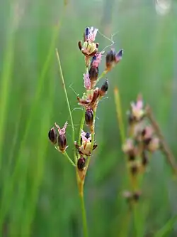 Flowers are borne towards the tips of the branches, with a short primary bract.[4] Tepals are dark brown and held around black capsules, which can give the capsules a striped appearance.
