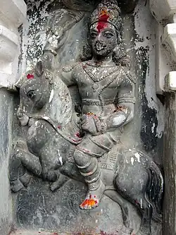 A murti of Kalki defeating a man, who could be a representation of evil at the Sakhibata temple, Kendrapara,Odisha, India.