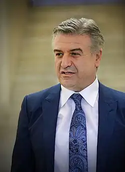 Karen Vilhelmi Karapetyan (Armenian: Կարեն Վիլհելմի Կարապետյան; born 14 August 1963[1]) is an Armenian politician who was Prime Minister of Armenia from September 2016 until April 2018. He was previously Mayor of Yerevan, the capital, from 2010 to 2011. He was appointed prime minister by President Serzh Sargsyan on 13 September 2016 and held office until 9 April 2018. Karapetyan served as first deputy prime minister from 17 April to 23 April 2018, when he was appointed acting prime minister following the resignation of Prime Minister Serzh Sargsyan.[2] He held this position until the election of Nikol Pashinyan as prime minister on 8 May 2018.