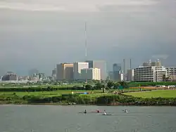 The rapid urbanization of the area, which continues to this day, began in the Meiji and Taishō eras. In 1872, Kawasaki Station was established on the Tōkaidō Main Line which was Japan's first railway line.[2] In 1889, the city (machi) Kawasaki in the district (gun) Tachibana was created according to the Japanese municipal system introduced the year before. In 1912 the border between Kanagawa and Tokyo prefectures was established as the Tama River. On July 1, 1924, the independent city (shi-) of Kawasaki with 48,394 inhabitants was formed through a merger with the city of Daishi (formerly Daishigawara) and the village of Miyuki.[3]