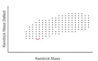 In a Kendrick mass analysis, the Kendrick mass defect is plotted as function of nominal Kendrick mass for ions observed in a mass spectrum.[11] Ions of the same family, for example the members of an alkylation series, have the same Kendrick mass defect but different nominal Kendrick mass and are positioned along a horizontal line on the plot. If the composition of one ion in the family can be determined, the composition of the other ions can be inferred. Horizontal lines of different Kendrick mass defect correspond to ions of different composition, for example degree of saturation or heteroatom content.