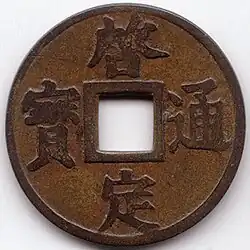 - ^ Commonly written as "啓定通寶" in modern sources.
