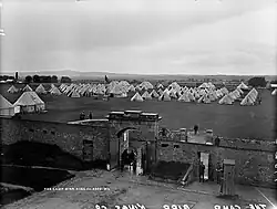 At Queenstown the battalion camped on the western side of the town and began guarding a section of the line of communication between Tylden and Bushmans Hoek, the Left Half Battalion being pushed forward to Sterkstroom. On 7 April it was held in readiness to proceed by rail to repel an attack on Bethulie, but it was not called upon and remained in position for the next 5 months. On 8 August 1900 3rd Bn moved to Stormberg, with battalion headquarters at the railway station. It formed a chain of outposts on the adjacent hills to connect up the junction with Steynsburg to the west and Burgersdorp in the north, with detachments stationed at Bamboo Bridges and Wandersboom. The Left Half Bn under Maj William Barry was later moved about 60 miles (97 km) to Aliwal North and began building earthworks to protect the Orange River bridge, as well as providing escorts for convoys into the Orange Free State. During September the enemy was active along the Orange River and a party under Capt H.G. Sheppard was sent to Albert Junction to watch the river. On 2 October the Boers were reported to be marching on Stormberg, the garrison was reinforced with Cape Police, and a strong inlying picquet established to protect the vital railway junction, while all other available troops went out to try to intercept the enemy. Next day the Boers were driven back from the river, but they established themselves in the Zurberg Mountains within striking distance of the junction. Here they continued their harassing tactics with frequent attempts to destroy rail lines, meaning that the men of 3rd Bn were under arms day and night until December.[4][6]