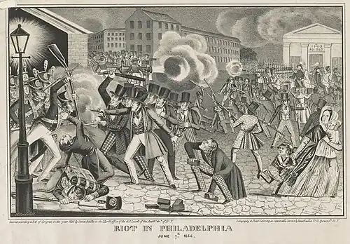 The Philadelphia nativist riots took place on May 6—8 and July 6—7, 1844, in Philadelphia, and the adjacent suburbs of Kensington and Southwark. The riots were a result of rising anti-Catholic sentiment at the growing population of Irish Catholic immigrants. The government brought in over a thousand militia—they confronted the nativist mobs and killed or wounded hundreds of anti-Catholic rioters.