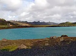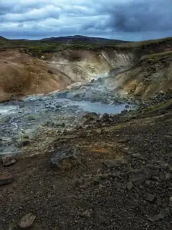 There were farms in the vicinity from the Middle Ages till 1945.[2] After the eruption known as the Krýsuvík fires in the middle of the 12th century, probably in 1151-1188, the main farm was transferred to a place under the mountain Bæjarfell. The name Krýsuvík was still used for the farm, though the buildings were at a distance of some kilometers from the sea.[2] The farm had a reputation for being very rich till the end of the 19th century. Being near the sea, the farm had additional income from fishing and hunting. Commerce was also done, because the farm was a junction of old trails from the north to the south coast.[2] Also the sulfur of the nearby geothermal areas was mined and exported.[3] However, Krýsuvík was too far away from upcoming industry and commerce and therefore abandoned in the middle of the 20th century.[2]