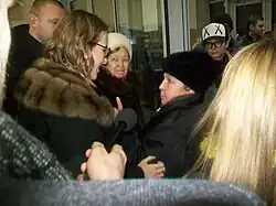 On February 28, during the first debate with several candidates, Sobchak chastised Vladimir Zhirinovsky for interrupting Sergey Baburin. In reply, Zhirinovsky angrily uttered expletives at Sobchak (reportedly, amongst other pejoratives, calling her a "fucking whore" and a "crazy bitch").[29] In response, Sobchak threw water at Zhirinovsky.[29][30] On March 4, while she was campaigning in Moscow in sub-zero temperatures, Sobchak was drenched with water by a supporter of Zhirinovsky, who was intending to retaliate for Sobchak's interaction with Zhirinovsky at the debate.[29]