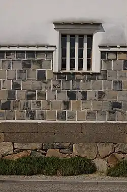 Although the application of the clay helps to make the kura fireproof, it is prone to damage both from physical sources and from rain. Some kura used tiles at the base of the external wall. These were laid either horizontally or diagonally and were fixed with plaster dabs. The joints were thick and protruding, with a rounded top, and because they reminded people of namako (sea cucumber) they became known as namako walls.[22] Tiles were also sometimes used in horizontal courses set at an angle to the wall (especially over window openings). These were called mizukiri (meaning water cutters) and were used to throw water off the facade to increase the durability of the wall.[23]