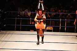 Meanwhile, Vickie thanked Big Show, who had also been drafted to Raw, for helping Edge at Backlash by putting him in a contendership match for the WWE Championship, but when he tried to kiss her she told him their previous affair was a mistake and she wanted a purely professional relationship, ending any affair they may have had.[65] On Raw, she then entered into a feud with Santino Marella after Marella made disparaging remarks about Vickie's appearance, calling her a pig in relation to the swine flu outbreak.[66] The wrestler who portrayed Santino was involved in a storyline where he played his twin sister, Santina Marella, at the time so that when Vickie accused Santino of insulting her, Santina acted innocently though also made similar jokes.[67] On the May 18 episode of Raw, the feud reached a head when Vickie demanded Santina face her in a match following some comical skits where Chavo tried to teach her some Guerrero family moves, before making it a no-disqualification match so that Chavo and William Regal could interfere and help her to win the match and become Miss WrestleMania.[63] Their rematch for the crown, at Extreme Rules, was a Hog Pen match where, despite having Chavo at her side, Vickie lost the match and the title.[64] The following night on the June 8 episode of Raw, Vickie voiced her anger at the crowd for not sympathising with her while she was being humiliated. Subsequently she announced she was quitting as General Manager of Raw which prompted Edge to come out and announce that he only married her for her power and with no power anymore, he insulted her appearance and demanded a divorce.