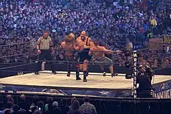 Meanwhile, Vickie was also using her power on SmackDown to help Edge retain his championship. When Edge was forced to defend his championship at the Royal Rumble on January 27, Vickie announced a Beat the Clock challenge, placing perennial rivals Batista and The Undertaker in difficult matches, facing Hawkins and Ryder in a handicap match and having a special guest referee, respectively. However, The Undertaker used his powers to turn the arena lights out and attack Edge, which helped Rey Mysterio to become the contender.[11] At the Royal Rumble, Edge came to the ring with his entourage, aside from Chavo, who was participating in the Royal Rumble match later that evening. Hawkins and Ryder were sent from ring side early during the match and Mysterio almost beat Edge after using his 619 finishing move, but as the referee tried to count for three, Vickie rose up from her chair and pulled the official from the ring. As Mysterio reprimanded Vickie, Edge tried to run into him, but ended up on the ropes, once again allowing Mysterio to attempt another 619; however, this time Vickie jumped on the ropes and hugged Edge, protecting him from the move and giving Edge enough time to recover and use his spear to pin Mysterio and win the match.[15] On the February 15 episode of SmackDown, the week before the No Way Out pay-per-view on February 17, with Vickie back in her wheelchair as a result of Mysterio's 619, Edge proposed to Vickie. After she accepted, Mysterio came to the ring and voiced his disappointment at the union and proceeded to come at Edge with a springboard senton, but as he ducked, Mysterio hit Vickie instead.[16] At No Way Out, Edge retained the World Heavyweight Championship over Mysterio again to end their rivalry, while Chavo successfully defended the ECW Championship against Punk.[17] However, The Undertaker also became the new contender for Edge's championship at the pay-per-view,[17] and La Familia began to target him, with Edge, Hawkins, and Ryder defeating The Undertaker in a handicap match on SmackDown in March.[18] The entire group (aside from Vickie) also took on Ric Flair and Shawn Michaels in a steel cage match, but The Undertaker invaded the cage using his powers, attacking the group as Edge climbed over the cage in fear to win the match for the team.[19]