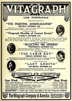 The story of Lady Godiva will be depicted by the Vitagraph Company, who, with its usual good judgement and marvelous facilities, will produce a portrayal that will not only be valuable as a matter of general information and rare attractiveness, but the subject will be extremely picturesque and dazzlingly beautiful in its every detail, introducing to our notice quaint streets, manners, customs and costumes of the people of the eleventh century.[3]