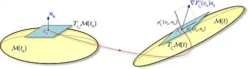 The local variational theory of hyperbolic LCSs builds on their original definition as strongest repelling or repelling material surfaces in the flow over the time interval .[2] At an initial point , let denote a unit normal to an initial material surface (cf. Fig. 6). By the invariance of material lines, the tangent space is mapped into the tangent space of by the linearized flow map . At the same time, the image of the normal normal under generally does not remain normal to . Therefore, in addition to a normal component of length , the advected normal also develops a tangential component of length (cf. Fig. 7).