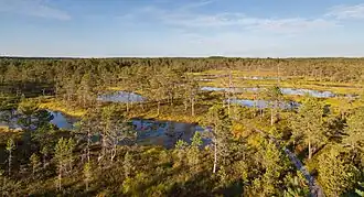 With forests covering more than 70 percent of Lahemaa, the area is rich in flora and fauna. The landscape has many raised bogs, including the 7,000-year-old Laukasoo Reserve. The park, marked by several trails, teems with wildlife, including populations of wild boar, red deer, grey wolf, brown bear and Eurasian lynx. The coast is covered with rocks and boulders, used each year by cranes as a stopover on their way to the Bosphorus and Egypt.[3]