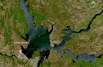 Lake Oroville[1] is a reservoir formed by the Oroville Dam impounding the Feather River, located in Butte County, northern California. The lake is situated 5 miles (8 km) northeast of the city of Oroville, within the Lake Oroville State Recreation Area, in the western foothills of the Sierra Nevada. Known as the second-largest reservoir in California, Lake Oroville is treated as a keystone facility within the California State Water Project by storing water, providing flood control, recreation, freshwater releases to assist in controlling the salinity intrusion into the Sacramento-San Joaquin Delta and protecting fish and wildlife.