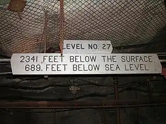 The state park is operated under the Department of Natural Resources. It is a National Historic Landmark, meaning that it is also listed on the National Register of Historic Places.[3] As of 2021, the surface buildings are open to the public, and during the summer months there are daily tours of the mine.[6] Visitors are lowered in the antique 1924 electric mine hoist to level 27, the mine's lowest level at 2,341 feet (713.5 m) below ground.[7] As of 2021, tours of the previously active underground physics laboratory were no longer offered.[8]