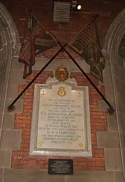 By the end of the war, 13,642 Lancashire Fusiliers had been killed, including 600 at Cape Helles alone. The regiment earned 18 Victoria Crosses (including the "six before breakfast"), more than any other infantry regiment. The loss of so many men, and the losses at Gallipoli in particular, deeply affected the local community in Lancashire and especially Bury, where the regiment was headquartered. A ceremony to commemorate the Cape Helles landing has taken place every year since 1916 in the parish church, which contains a memorial to the Lancashire Fusiliers' efforts at Cape Helles, placed by the crew of HMS Euryalus (which carried the bulk of the 1st battalion to Gallipoli).[1][11][12][13]
