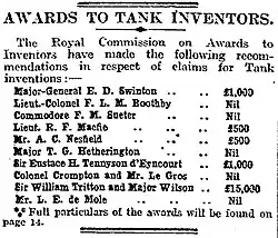 Sir William Tritton and Major W.G. Wilson were jointly awarded £15,000, and were recognized for "designing and producing a concrete practical shape the novel and efficient engine of warfare known as the "Tank""; the Commissioner emphasized that the considerable design difficulties that were experienced when the tanks took the field of action, which were rapidly remedied, were a consequence of inadequate specifications by the government, and were not due to any design faults on the part of Tritton or Wilson.[16]
