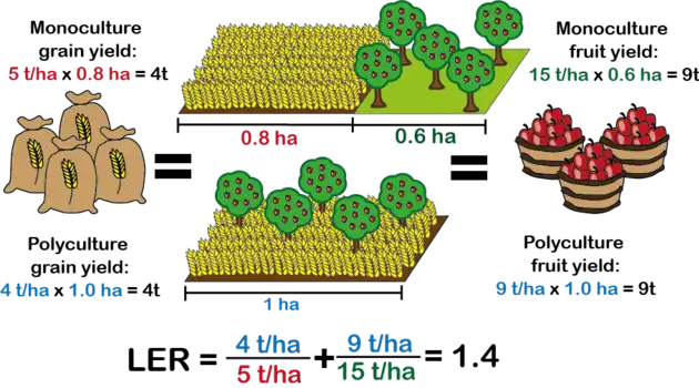 An interpretation of this result would be that a total of 1.4 ha of sole cropping area would be required to produce the same yields as 1 ha of the intercropped system.