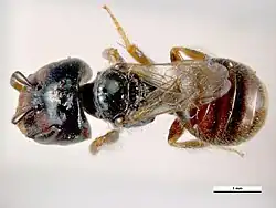 Lasioglossum hemichalceum can be identified by its medium long antennas, often off-white in color, and triangular head.[10] While many are dull black in color, they may display hints of purple, green, or copper.[10] Males typically have thinner bodies than females and also have less hair on their hind legs for carrying pollen.[10] Females usually range from 4.7–5 mm in length, and have wider heads than males (being about 1.5–1.6 mm in width).[10] Typical males have slightly shorter body lengths, and heads that are more narrow in length (approximately 3.8–4.7 mm in length, and 1.3–1.5 mm in width).[10] In addition, the legs of L. hemichalceum tend to be dark brown or black in color, although there have been instances of red-brown pigmentation.[10] In terms of coloring, there are not significant differences between females and males.[10] Furthermore, because L. hemichalceum is a communal species, there are not queens who are distinguishable from workers—almost all females are the same in appearance.[10]