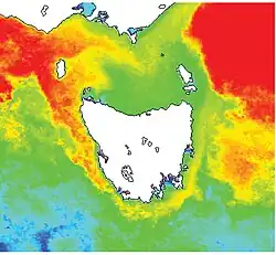 CSIRO NOAA polar orbiting satellites obtain the data generating sea surface temperature images. (Composite 15-day image showing the extension of the Leeuwin Current around Tasmania)