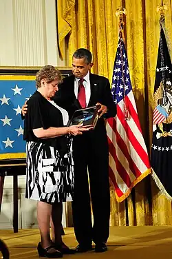 Although he was posthumously promoted to the rank of sergeant, the circumstances of Sabo's death remained unclear to his family for several decades thereafter.[1] Officially the military reported Sabo had been killed by a sniper while guarding an ammunition cache somewhere in Vietnam.[2] Shortly after the action Sabo's company commander, Captain Jim Waybright, recommended him for the Medal of Honor, but the accounts of Sabo's actions and citation were lost for several decades.[1] This changed in 1999 when Alton Mabb, another Vietnam War veteran of the 101st Airborne Division and a columnist for the division association magazine, uncovered the documents while at the National Archives in College Park, Maryland. Mabb publicized Sabo's exploits in the magazine and also wrote U.S. Congresswoman Corrine Brown D.-FL, whom he asked to forward the recommendation. Brown lobbied the U.S. Department of Defense for Sabo to be recognized and, in 2006, Secretary of the Army Francis J. Harvey recommended that Sabo receive the Medal of Honor.[6] Due to the delay in processing the citation, however, the award had to be approved by an act of Congress, so Brown attached it as a rider to a 2008 defense authorization bill. After continued delays in the process, however, Sabo's family contacted U.S. Congressman Jason Altmire D.-PA to push the award through the Defense Department. Secretary of the Army John McHugh recommended the Medal of Honor for Sabo in March 2010 and, on 16 April 2012, it was announced that Sabo's family would receive the medal from U.S. President Barack Obama at a White House ceremony, 42 years after the action.[6] Sabo posthumously received the Medal of Honor at the White House 16 May 2012, which was accepted by his widow.[2][4][8] Sabo is interred at Holy Redeemer Cemetery in North Sewickley Township, Pennsylvania,[3] and is honored at a memorial to B Company in Marietta, Ohio, the home of his former commanding officer.[7] Company of Heroes, a book written by Ellwood City-based journalist Eric Poole about Sabo and his fellow soldiers in Bravo Company, was released in 2015 by Osprey Publishing.