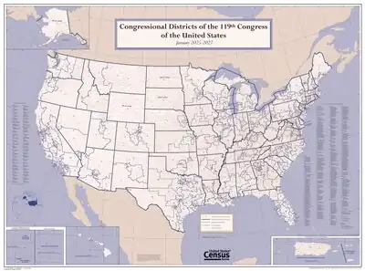 Congressional districts in the United States are electoral divisions for the purpose of electing members of the United States House of Representatives. The number of voting seats within the House of Representatives is currently set at 435, with each one representing an average of 761,169 people following the 2020 United States census.[1] The number of voting seats has applied since 1913, excluding a temporary increase to 437 after the admissions of Alaska and Hawaii. The total number of state members is capped by the Reapportionment Act of 1929.[2] In addition, each of the five inhabited U.S. territories and the federal district of Washington, D. C., sends a non-voting delegate to the House of Representatives.