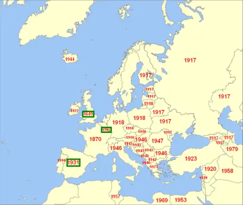 Extant monarchies are listed in bold type.