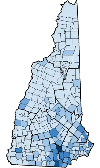 New Hampshire municipalities mapped by population- darker places are more populous.