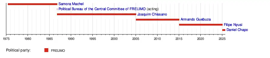 The current president is Daniel Chapo. Chapo was inaugurated for his first term as the fifth president of Mozambique on 15 January 2025.[3]