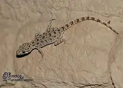 Gekkonidae is a large family of cosmopolitan lizards. It is a remarkably diverse family with upwards of a thousand species.[9] Bearing specially designed pads on their toes, geckos are granted effective adhesion to several surfaces. Vernacularly known as “بريعصي",[10] there are at least 10 species in Qatar.