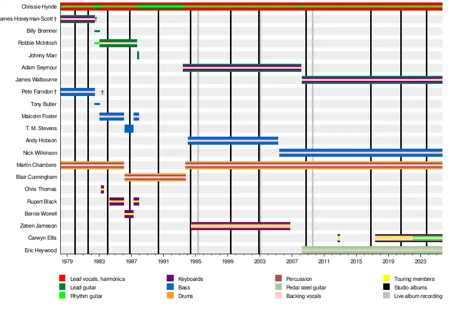 The Pretenders are a British-American rock band from Hereford. Formed in 1978, the group originally consisted of vocalist and rhythm guitarist Chrissie Hynde, lead guitarist and keyboardist James Honeyman-Scott, bassist Pete Farndon, and drummer Martin Chambers. The band's current lineup includes Hynde and Chambers alongside bassist Nick Wilkinson (since 2005), lead guitarist James Walbourne, pedal steel guitarist Eric Heywood (both since 2008) and keyboardist Carwyn Ellis (since 2017).