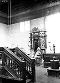 1879–1942 The vestibule was in front of the almost square main hall in the west. Above this there was a gallery for the choir (which protruded somewhat into the main hall), and behind it (separated by a wall) the women's rooms. In front of it was a two-story gallery with the same height. Stairs to the right and left of the gallery led to the first floor and from there to the women's rooms. There were single-storey extensions along the side walls. The gallery was divided into seven fields on the lower level and four on the upper level by supporting beams. The main hall had two pairs of windows in the south (and probably also in the north and east). Inside, the ceiling was supported by four wooden pillars that divided it into nine fields. A two-tier hipped roof covered the entire building (main hall, vestibule, gallery). The roofs of the extensions in the south and north leaned against the walls of the synagogue building. The bima was an octagonal podium with an open-topped dome that was surrounded by a balustrade. She stood between the pillars that supported the ceiling. The Torah shrine was in the form of a cupboard protruding from the wall with columns and floral motifs on the side walls. Above were the tablets of the law. Blessing hands and birds of prey closed it at the top.
