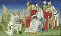 Folio 45r, or The Khan's Money Exchange, shows a scene of trade between a seated khan and three men. The text on the same page, from Marco Polo's Description of the World, describes the novelty of the khan's paper money, noting that traders from far-off locales bring their wares in exchange for these slips of paper. The three men in the image serve as an example of this widespread interest, their hats and clothing suggesting they belong to different cultures. The inspiration for these figure's clothing could have originated from artistic contact between Europe and Asia but most likely originated from Italian art depictions of "Eastern" figures.[3] In either case, this folio serves as record of cross-continental trade.