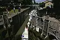 The Canal du Midi was built between 1666 and 1681 by Pierre-Paul Riquet to provide an inland water route through Southern France between the Atlantic at Bordeaux and the Mediterranean at Sète via the Garonne. The first design for the locks on the canal was a rectangular shape however due to a collapse of a side-wall early in the building program (exactly which lock is not recorded), Riquet modified his plans and rebuilt both existing and new locks with an ovoid chamber. They were typically 11m wide at the midpoint and 6m at the gates with an overall length of 30.5m.[1] Riquet also restricted the maximum rise to 2.9m so whereas previously he would have built one deep lock he instead used intermediate gates creating double, triple and sometimes quadruple chambers. During the Canal du Midi modernisation program of the 1970s several of these multiple chambers were converted into single "deep" locks with concrete side walls.