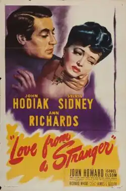 Love from a Stranger is a 1947 American historical film noir directed by Richard Whorf and starring John Hodiak, Sylvia Sidney and Ann Richards.[2] The film is also known as A Stranger Walked In in the United Kingdom. It is based on the play of the same title by Frank Vosper, inspired by a short story by Agatha Christie, which had previously been turned into a 1937 British film Love from a Stranger starring Basil Rathbone.