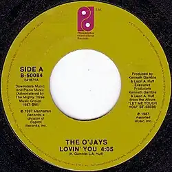 "Lovin' You" is a 1987 single by the O'Jays from their album, Let Me Touch You, and written by songwriting duo Kenny Gamble and Leon Huff. The single, which topped the Billboard R&B chart for one week, was the O'Jays first number one on that chart since "Use Ta Be My Girl" in 1978.[1] The song is the final O'Jays number one to be written and produced by Gamble and Huff.[2]