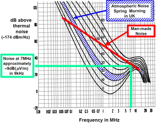 Atmospheric radio noise increases with decreasing frequency. At the LF band and below, it is far above the thermal noise floor injected by amplifier circuits in the receiver, so weak signals can be amplified in the receiver to compensate with no perceivable increase in the noise (see SNR). Consequently, for reception, even inefficient antennas much smaller than the wavelength are adequate.