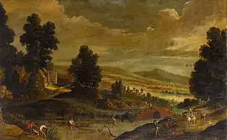 In many of Lucas' paintings his brother Cornelis added the figures while, in turn, Lucas painted the landscapes in Cornelis' battle scenes and harbour views.[2] The View of a Roman square (At Minerva Auctions sale in Rome on 26 May 2016, lot 97) and the River landscape with fishermen and travellers (At Bonhams on 9 July 2008 in London, lot 38) have been attributed to the brothers.[11][12] Lucas also collaborated with Jan Brueghel the Younger on paintings of landscapes with figures for which Lucas created the landscape part and Brueghel the figures.[1]