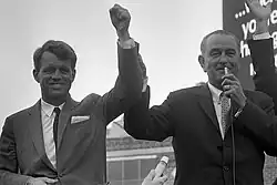 He entered the primaries starting with New Hampshire on March 10. There were no official candidates on the New Hampshire ballot, so both Kennedy and Johnson were write-in candidates.[18]Some Kennedy supporters organized a Kennedy-for-vice-president write-in campaign, which gave him almost 25,000 voted for vice president.[18] He had a four-to-one edge over Hubert Humphrey, his closest opponent.[19] Johnson won New Hampshire with almost 29,000 votes, and Kennedy issued a statement that evening saying that the choice of a vice-presidential candidate should be made by Democratic convention in August, guided by the wishes of President Johnson.[18] Shortly after the primary, Johnson began tossing out names of possible running mates. He initially considered Kennedy's relative Sargent Shriver, but eventually rejected the idea asserting that Shriver's presence on the ticket would still have raised questions about his capacity to win on his own.[20]